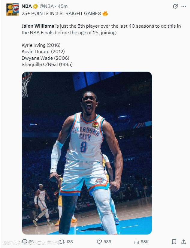 杰威还成为过去40年第五位25岁之前在总决赛连续三场比赛25+;