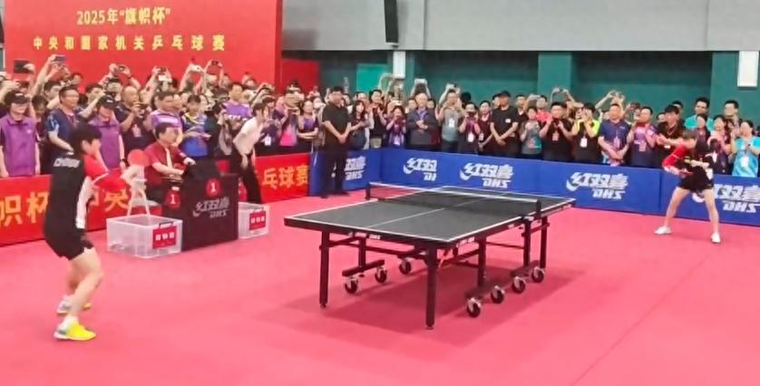 到了乒乓球赛的现场,三位奥运冠军自然是要展示一下球技。孙颖莎与王曼昱同台对打,两人展现了一把中远台实力。孙颖莎一直正手进攻,王曼昱在反手防守了几板之后也转换成正手,两人正手对拉看的围观球迷很是兴奋。