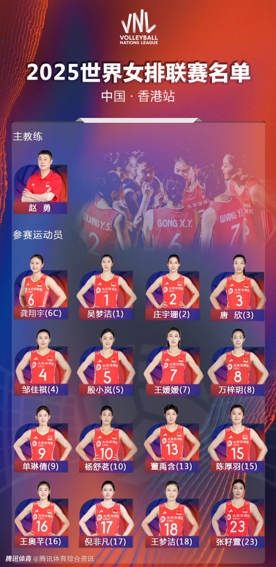 世界女排联赛中国香港站中国队名单出炉:吴梦洁龚翔宇领衔 王梦洁杨舒茗在列