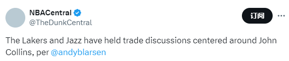 爵士队记:湖人有意得到爵士球员科林斯 双方已展开交易讨论
