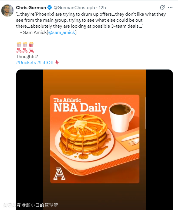 TA记者萨姆-阿米克:太阳队还在试图争取更多的要价,他们对火箭提出的方案并不满意,他们正在考虑拉入第三方球队讨论可以合作的方法。