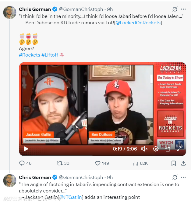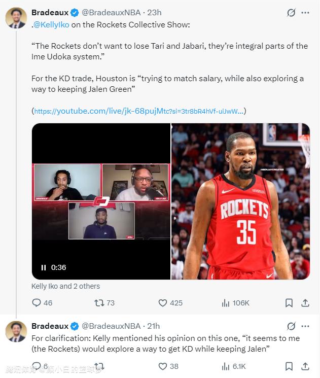 2025-06-19 10:00北京时间6月18日,TA记者凯利-伊科、队记Bradeaux、队记Biased三人在播客节目中透露——休斯顿火箭队正在探索留下杰伦-格林又换来凯文-杜兰特的方案,伊森、小贾巴里也不会纳入交易。