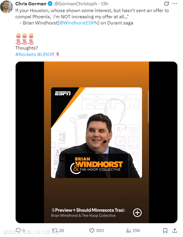 ESPN记者布莱恩-文霍斯特则明确表态:如果我是休斯顿火箭队,当太阳队提出想与我进行交易,但太阳队并没有明确想要什么筹码时,我绝对不会提高报价。
