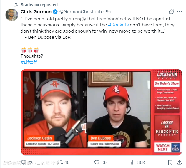 北京时间6月19日,火箭《今日美国》记者本-杜博斯在与火箭队记杰克逊-加特林的播客节目中还说道:“有消息人士告诉我,范弗利特也不会纳入这些交易讨论,原因很简单,火箭队没有找到比他更好的一号位,管理层觉得牺牲范弗利特这样的即战力根本不值得。”