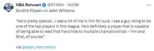 2025-06-19 22:30北京时间6月19日,NBA名宿斯科蒂-皮蓬在谈到雷霆球员杰伦-威廉姆斯时表示,在他的身上看到了很多自己的影子。