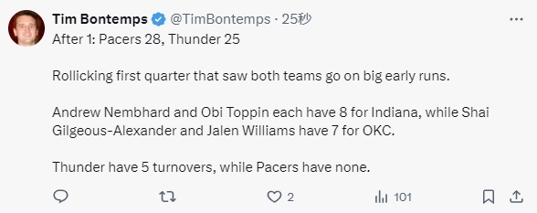 轰24-7攻击波!步行者首节领先3分 雷霆内线多得12分罚球少6个