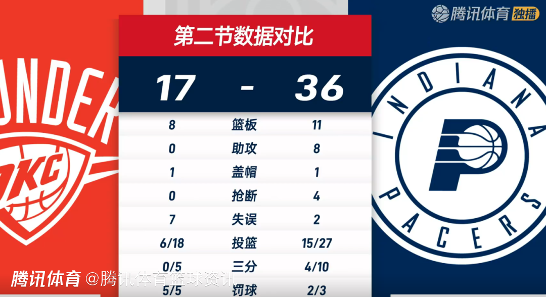 第二节是步行者拉开分差的关键,本节步行者打了雷霆一个36-21,单节助攻8-0,抢断4-0,失误2-7,这节步行者27中15,三分球10中4,而雷霆则是18中6,三分球5中0。
