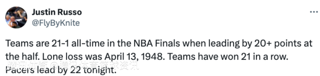 据统计,NBA总决赛历史上,半场领先20分的球队,战绩来到21胜1负(21连胜),唯一一次失利还要追溯到1948年4月13日。