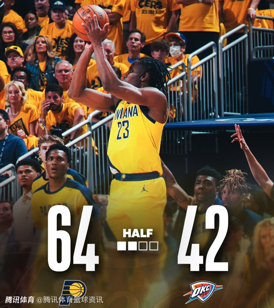 2025-06-20 10:10北京时间6月20日,NBA总决赛G6,步行者主场以64-42领先雷霆22分。