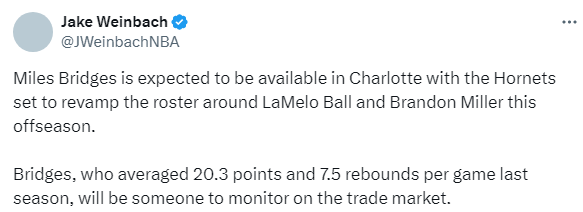 2025-06-21 10:50北京时间6月21日,据记者Jake Weinbach报道,迈尔斯-布里奇斯预计将被球队摆上交易货架,黄蜂队计划在今年休赛期围绕拉梅洛-鲍尔和布兰登-米勒重组阵容。