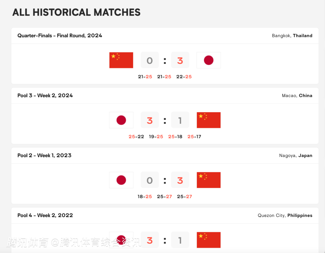 2024年澳门站 中国女排1-3(22-25、25-19、18-25、17-25)负于日本女排。