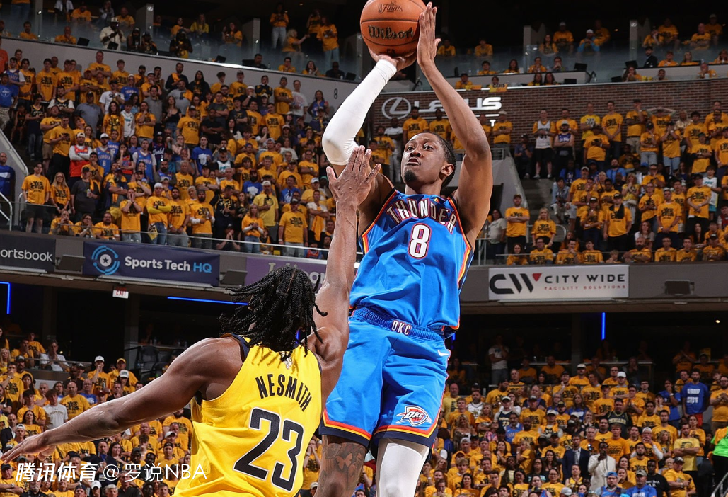 雷霆胜负场进攻效率差:总决赛三场胜场中,雷霆百回合得120.4分,三场负场仅101.0分,差值19.4分,比步行者的进攻波动(110.6与108.5)更具决定性。