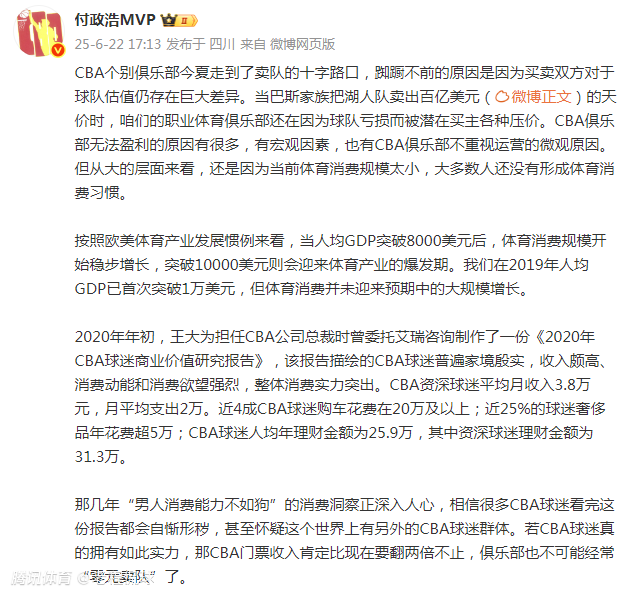 2025-06-22 23:30媒体人付政浩透露,CBA个别球队想出售球队,但因为亏损被潜在买主各种压价,导致球队交易迟迟无法推动的原因是双方对球队估值存在巨大差异。