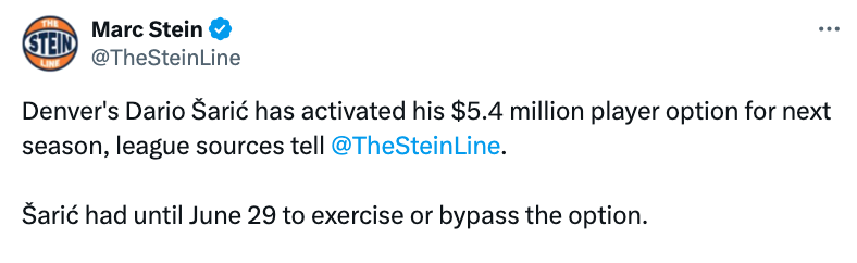 2025-06-23 01:40北京时间6月23日,据名记Marc Stein报道,丹佛掘金的萨里奇已执行下赛季价值540万美元的球员选项,他原本需在6月29日前决定是否执行该选项。