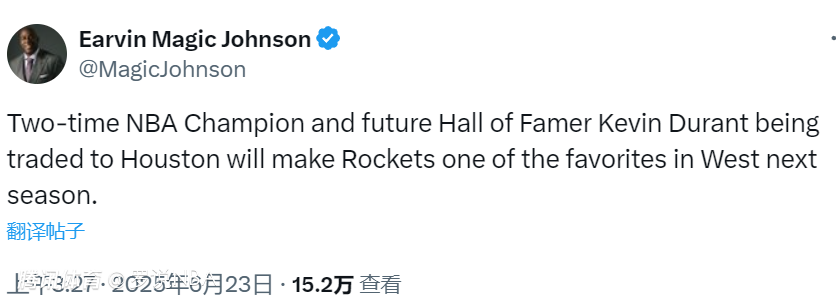 赔率的明显波动,说明外界对火箭看好程度的变化。就像“魔术师”约翰逊说的那样:“两届NBA总冠军、未来名人堂成员凯文杜兰特被交易至休斯顿火箭队将使火箭队成为下赛季西部最热门的球队之一。”