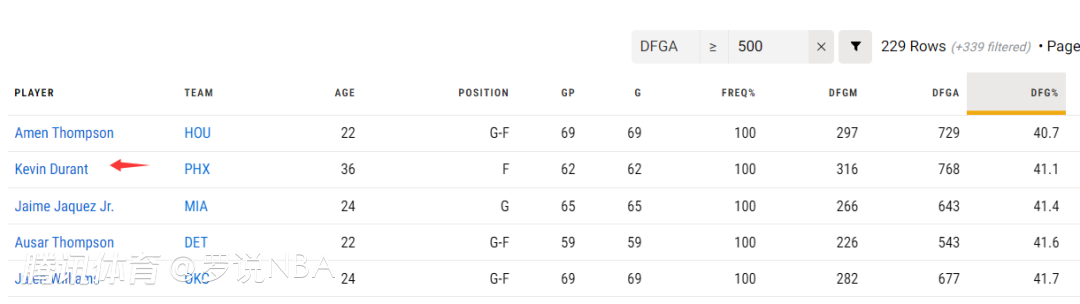 杜兰特在进攻端的能力毋庸置疑,他在防守端的作用,却常常被低估。一项数据也体现了KD防守的价值,本赛季常规赛,防守端限制对手命中率(至少500次防守)排名,阿门-汤普森在229名球员里位居第一,他对位防守只让对手的命中率达到40.7%,而排在第二的不是别人,正是杜兰特。在杜兰特对位防守时,对手出手768次,命中316球,命中率只有41.1%。