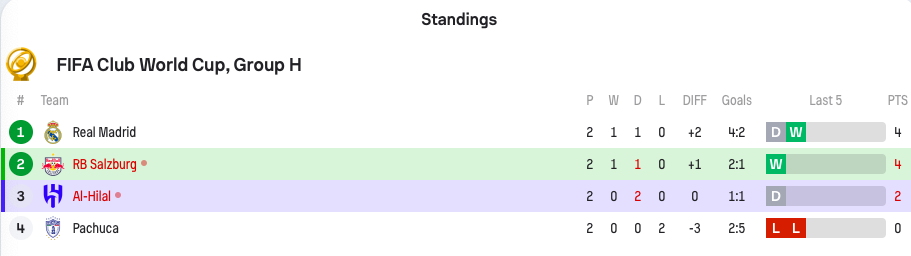 两轮战罢,皇马1胜1平积4分领跑小组,萨尔茨堡红牛同积4分排名第2。利雅得新月2平积2分排名第3,帕丘卡2连败垫底出局。4天后的27日9点,小组末轮2场同时打响。利雅得新月迎战帕丘卡,而皇马则与萨尔茨堡红牛交手。新月末轮只要净胜帕丘卡2球,即可确保晋级。