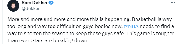 德克尔写道:“这种情况越来越频繁地发生。如今,篮球运动的赛程过于漫长,对球员的身体而言也过于艰难。NBA需要想办法缩短赛季,以保障球员的安全。现在的比赛比以往任何时候都更具挑战性,球星们的身体正在透支。”