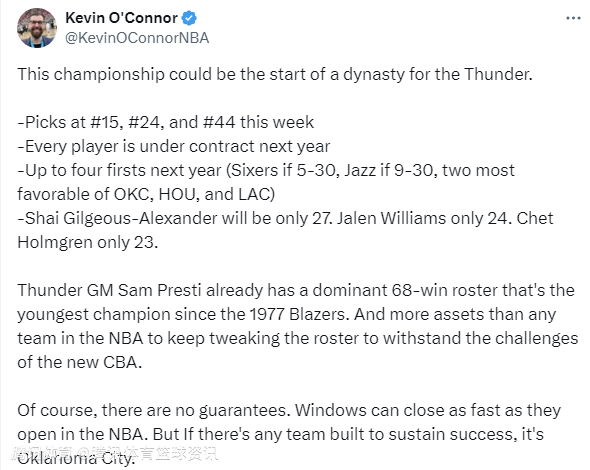 该记者写道:“这次总冠军或许会成为雷霆队王朝的开端。他们今年拥有第15、24和44顺位的选秀权。所有球员下赛季均处于合同期内。下赛季最多可获得四个首轮签(76 人队签:若顺位在5-30位;爵士队签:若顺位在9-30位;另外两个来自雷霆、火箭和快船三队中最有利的两个签位)。亚历山大年仅27岁,杰伦-威廉姆斯24岁,霍姆格伦23岁。