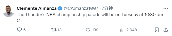 2025-06-23 11:50北京时间6月23日,NBA总决赛继续进行,雷霆队103-91击败步行者队,总比分4-3拿到总冠军。赛后,雷霆队记者Clemente Almanza更新个人推特,透露雷霆队将在当地时间本周二(北京时间本周三)上午10点30分举办总冠军游行活动。