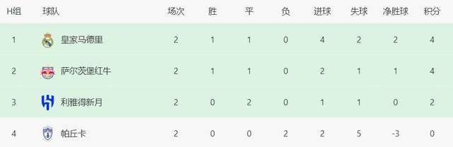 H组积分榜上,皇马4分领跑,萨尔茨堡也是4分,新月2分,帕丘卡0分出局。最后1轮,新月对阵帕丘卡,萨尔茨堡大战皇马。