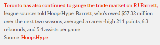 2025-06-24 06:10北京时间6月24日,据美媒HoopsHype的联盟消息源透露,猛龙仍在持续评估关于RJ-巴雷特的交易市场行情。