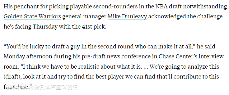 对于勇士拥有的41号签如何运作,邓利维表示:“在次轮选秀中,能选中一个真正能在联盟立足的球员就已经很幸运了。我们必须现实看待这一点,我们会分析本届选秀,研究并努力找到最能为球队做贡献的球员。”