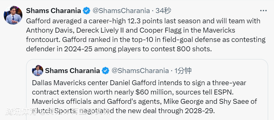 2025-06-24 07:50北京时间6月24日,据ESPN名记Shams报道,达拉斯独行侠中锋加福德将提前续签一份为期三年、价值近6000万美元的合同。独行侠官员和加福德的经纪人——Klutch Sports的迈克-乔治和夏伊-萨伊——共同商定了这份持续到2028-29赛季的新合同。