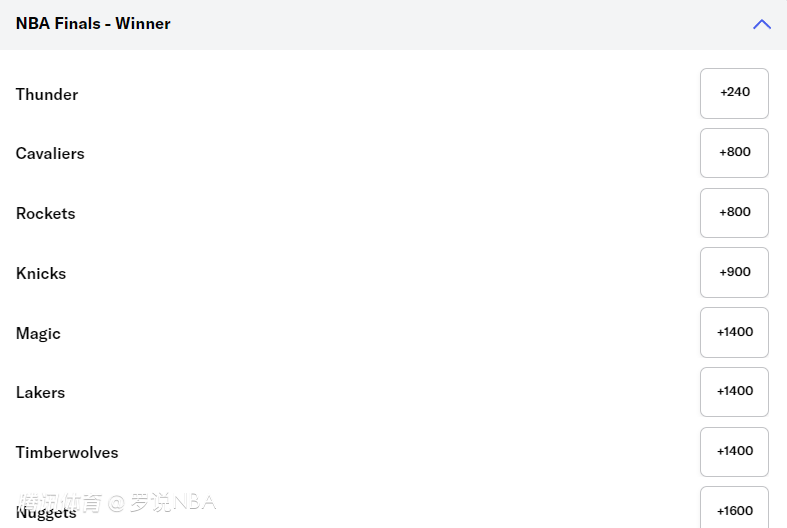 第1-15位:1.雷霆(+240)、2.骑士和火箭(+800)、4.尼克斯(+900)、5.魔术、湖人、森林狼(+1400)、8.掘金(+1600)、9.凯尔特人(+1800)、10.勇士和马刺(+2500)、12.独行侠、76人、快船(+3500)、15.步行者(+4000)