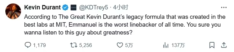 此番言论迅速引起热议,杜兰特更是直接现身评论区犀利回怼:“按照由伟大的杜兰特在麻省理工学院顶级实验室研发的‘传奇公式’来看,Emmanuel Acho堪称史上最糟糕的线卫。大家真的要听这种人定义什么是‘伟大’吗?”
