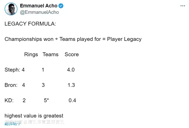 为直观展示公式应用,Acho以詹姆斯、库里、杜兰特三位球星举例:“库里效力1支球队斩获4座总冠军,得分4;詹姆斯辗转3队收获4冠,得分1.3;杜兰特历经5队拿下2冠,得分仅0.4。”