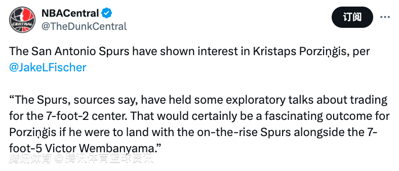 2025-06-25 00:00北京时间6月24日,据名记Jake Fischer报道,马刺对绿军中锋波尔津吉斯展现了兴趣。据消息人士透露,马刺已经就关于交易得到波神进行了一些试探性谈判,若波尔津吉斯最终加盟崛起中的马刺,与文班亚马搭档,无疑将构成极具看点的内线组合。