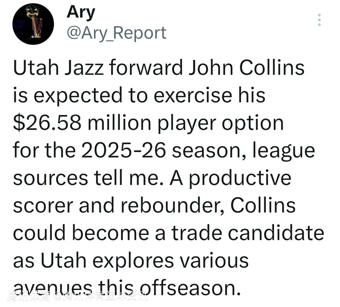 2025-06-25 08:30北京时间6月25日,据记者Ary报道,联盟消息源透露,爵士队球员约翰-科林斯预计将执行2025-26赛季价值2658万美元的球员选项。