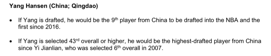 NBA官方预热选秀大会时,也单独提到了杨瀚森。NBA官方媒体写道:“如果杨瀚森被球队选中,他将成为中国历史上第9位被NBA球队选中的球员,也是2016年以来的第一位。如果杨瀚森在第43或者更高顺位被选中,他将成为中国自2007年易建联(第6顺位)以来最高顺位的球员。”以下是杨瀚森所有试训过的球队在本届选秀大会上拥有的选秀签。