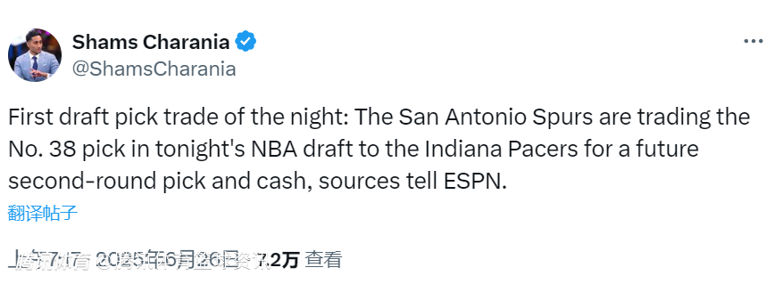 2025-06-26 07:40北京时间6月26日,NBA名记Shams报道,选秀夜的首笔交易已经出炉,马刺队送出今年选秀大会的38号签,从步行者队换来了一个未来次轮选秀权和现金。
