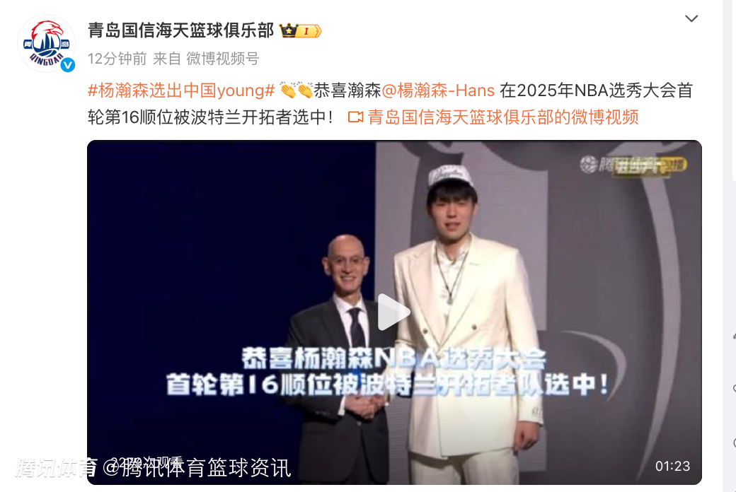 青岛男篮官方原文如下:恭喜瀚森在2025年NBA选秀大会首轮第16顺位被波特兰开拓者选中!