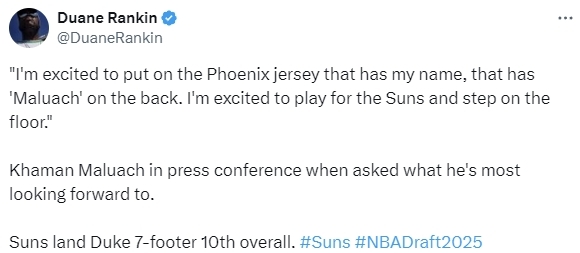值得一提的是,马鲁阿奇是杜兰特交易中的一部分,由于这笔交易还未正式完成,所以其实是火箭队替太阳队在第10顺位选中他。NBA总裁萧华也在马鲁阿奇被选中时说道:“我们有一笔交易要宣布,火箭选择的马卢阿奇将前往太阳,这是交易的一部分内容。”