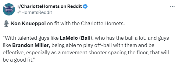 克纳佩尔说道:“拉梅洛(鲍尔)这样的天才球员会掌控球权,还有布兰登-米勒这样的球员,我能在他们身边打无球并保持效率,尤其是作为一名通过跑位投射来拉开空间的射手,这会很适配。”