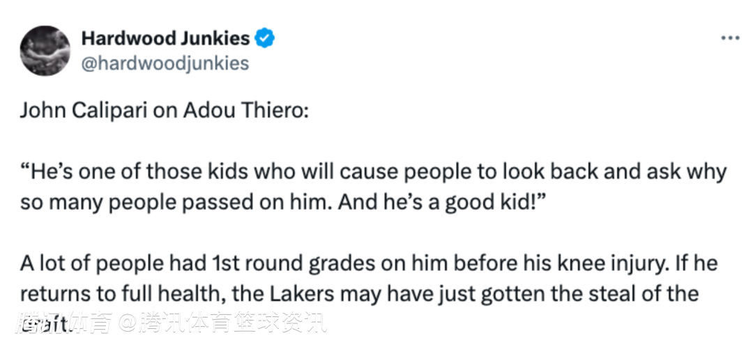 另外美记Matt Moore也表示,在蒂耶罗遭遇膝伤前,很多人曾给予他首轮的选秀评级,要是他能完全康复,湖人队说不定能够捡漏成功。