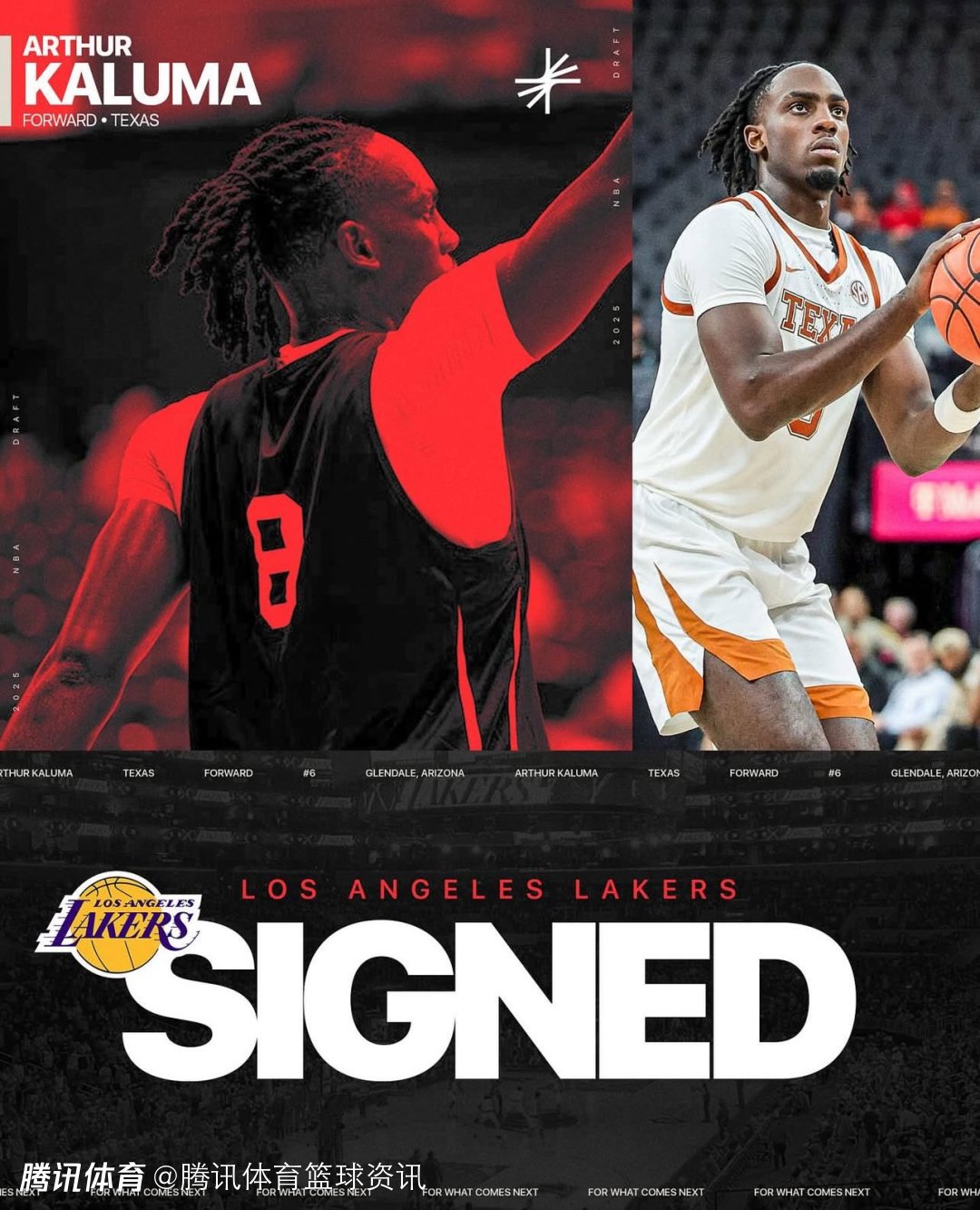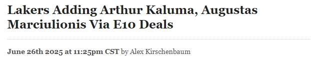 2025-06-27 13:00北京时间6月27日,根据湖人队记者Dan Woike和选秀专家Jonathan Givony报道,湖人队将通过Exhibit 10训练营合同签约多名新球员,其中就包括德克萨斯前锋亚瑟-卡卢马和圣玛丽大学控卫奥古斯塔斯-马修利奥尼斯。