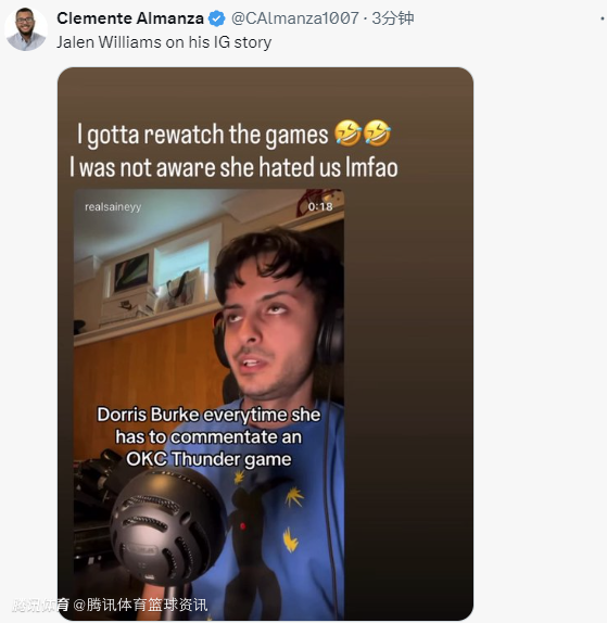 当时有网友分享了一条“多丽丝-伯克每次不得不解说俄克拉荷马城雷霆队比赛时的样子”的搞笑视频,杰伦-威廉姆斯转发了这条视频,还配文写道:“我得重新看一下比赛,之前都不知道她讨厌我们,笑死了。”
