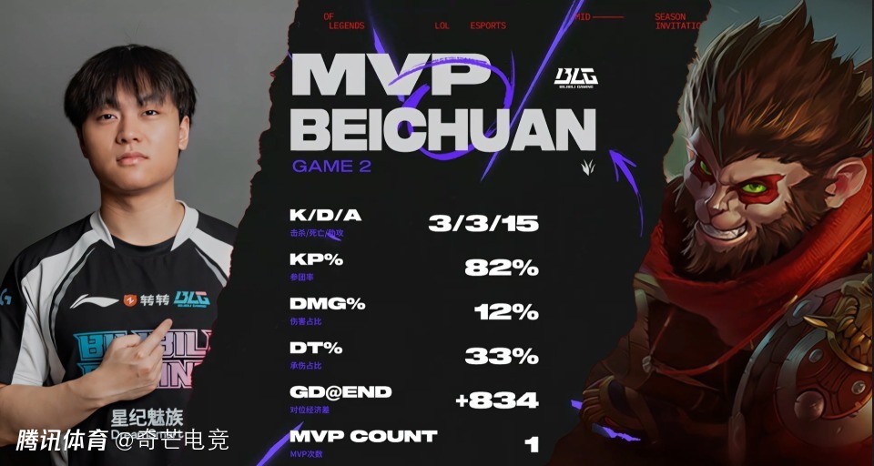 中期GAM先手打厄塔汗,BLG赶来后,北川猴子率先被秒,但是knight安妮完美大招,BLG打出1换2后,拿下厄塔汗。23分钟双方中路混战,GAM赛恩空R,虽然knight安妮被秒,但是Bin剑魔猛如战神收割,BLG打出2换5团灭GAM后,拿下土龙魂。26分钟BLG大龙逼团,GAM赶来后,Levi蔚率先被秒,BLG击杀GAM四人后,拿下第一条大龙。后期30分钟,GAM绝境打远古龙,BLG赶来直接团灭GAM,随后拿下第二局的胜利。MVP给到了北川猴子。