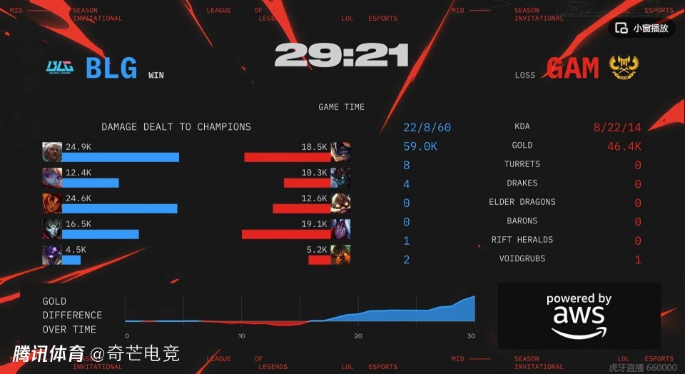 中期18分钟BLG就在下半野区击杀GAM四人,随后推掉了GAM下路高地塔。20分钟BLG拿下厄塔汗,GAM赶来开团,GAM终于打出好团,但是经济差距过大,BLG反打打出2换4。22分钟BLG拿下火龙魂。25分钟双方河道混战,BLG逐个击破团灭GAM,直接拿下比赛的胜利。