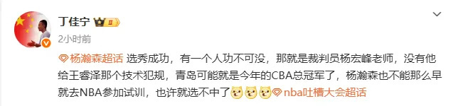 媒体人丁佳宁更新社媒发文调侃:“(杨瀚森)选秀成功,有一个人功不可没,那就是裁判员杨宏峰老师,没有他给王睿泽那个技术犯规,青岛可能就是今年的CBA总冠军了,杨瀚森也不能那么早就去NBA参加试训,也许就选不中了。”