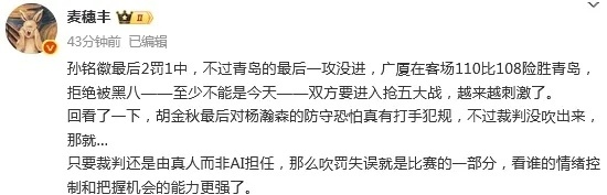 对此,不少觉得青岛男篮拥有2-1领先的局势下,G4主场作战却在吹罚尺度和争议吹罚方面持续吃亏,球迷质疑是有理有据。