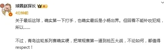 当时不少媒体吐槽,关于最后这球,确实第一下打手,也确实最后是小杨出界。但回看不能补吹犯规。