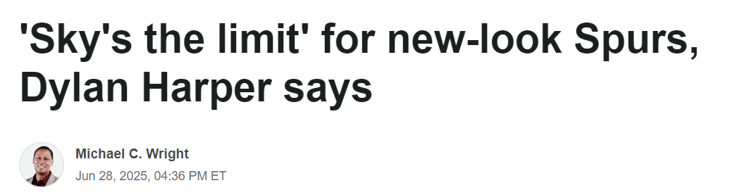 哈珀将身穿马刺2号球衣——上一位在马刺身披此号码的球员是前马刺总决赛MVP莱昂纳德。他还对自己帮助球队创造NBA历史的前景充满信心。马刺过去两年选中了NBA年度最佳新秀文班亚马和卡斯尔。在NBA历史上,目前还没有球队能连续三年产生该奖项得主。