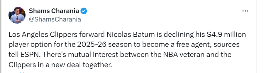 Shams:巴图姆拒绝490万球员选项 成自由球员后与快船互有意向续约