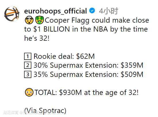 根据测算过程显示,弗拉格新秀合同价值6200万美元,随后可签五年30%超级顶薪3.59亿美元,再而后可签五年35%超级顶薪5.09亿美元。这样一来,当弗拉格来到32岁、打完第13个NBA赛季的时候,仅工资一项就将达到惊人的9.3亿美元。