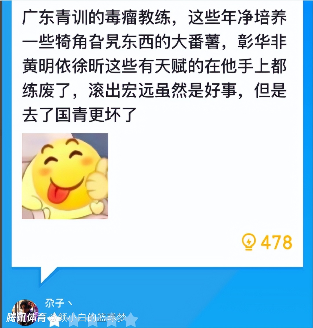 球迷:广东青训的毒瘤教练,这些年净培养一些犄角旮旯的大番薯,彰华非、黄明依、徐昕这些有天赋的选手都被他练废了,滚出宏远虽然是好事,但去了国青更坏了。